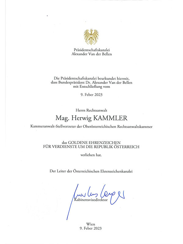 | Verleihung: | Goldenes Ehrenzeichen für Verdienste um die Republik Österreich. |